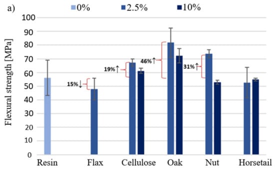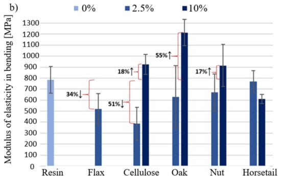 Figure 13a shows the bending strength of biocomposites with a given component. The greatest increase in bending strength was recorded for the addition of oak wood flour (46% ↑−2.5%). This relationship applies to both modifier percentages. There was a decrease in the tested value for flax fibers (15%) and a slight decrease for horsetail. It is worth noting that only in the case of horsetail, 10% of the additive shows a higher bending strength than the 2.5% share of the additive. According to the manufacturer’s data, the Epidian 652 resin has a flexural modulus of 2380 MPa. The obtained results for the pure resin and the composition with natural additives are much lower and amount to an average of 25% of this value for the addition of 2.5% of the modifier and 38% for the 10% additive. The introduction of modifiers in the amount of 2.5% to the matrix causes the appearance of places in the sample where the stresses caused during bending are partially dissipated in the material; this effect is lacking in the resin. The use of additives in the amount of 10% reduces the strength in relation to 2.5%, because this amount is already too high and the samples may form poorly filtered matrix agglomerates, which will be the weakest parts of the sample. Interpreting the results presented in Figure 13b for samples with less fillers, it could be concluded that they reduce the material’s stiffness. However, the obtained results are burdened with relatively large deviations of values, which may be caused by sample defects triggered by insufficient cross-linking of the epoxy matrix. Increasing the weight share of additives to 10% increased the modulus by 18%, 55% and 17%, respectively.