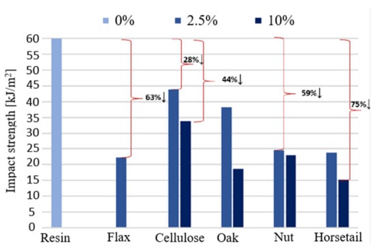 Figure 16 shows the results obtained during the impact strength test of the produced biocomposites. The results show that the introduction of even a small amount of the additive, in the form of powder, significantly deteriorates the impact resistance. In the case of using 2.5% of the additive, the smallest changes were recorded for the sample with cellulose. The impact strength decreased by 28%. The biggest changes were observed for the sample with flax fibers and horsetail, a decrease of 63% and 61%, respectively. The more modifiers were introduced, the greater the changes were. Increasing the proportion of the additive to 10% reduced the impact toughness even by 75% (horsetail). This behavior of the material results from the fact that the applied modifying phase (particles) does not act as a reinforcement, which dissipates and absorbs impact energy. The stresses caused by the impact, once they exceed the strength of the composite bond, cause the material to fracture.
