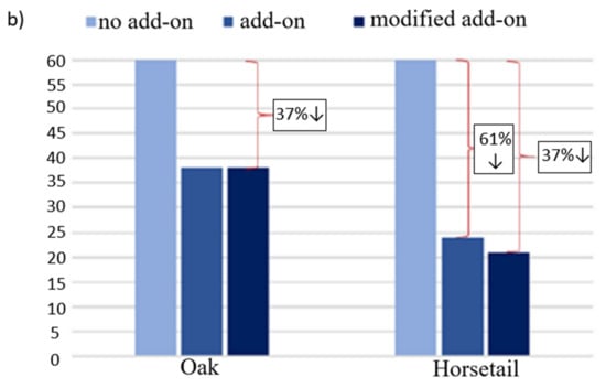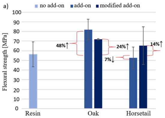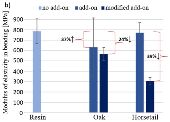 Turning now to the experimental evidence on the mechanical test results with additives subjected to modifications which depended on lignin removal, in the case of wood flour and carbonization of horsetail, no evidence was found that such treatments significantly affect the properties of the composites (Figure 17 and Figure 18).