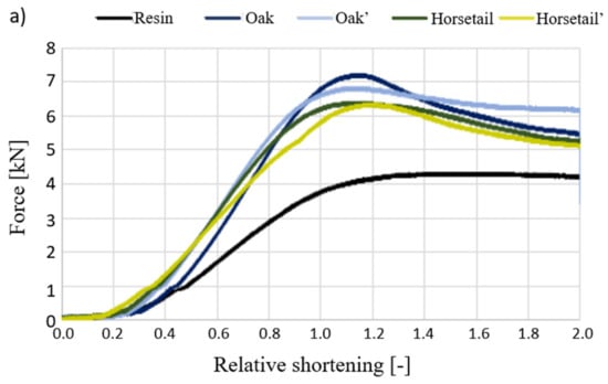 Figure 14 shows curves of the force vs. relative shortening obtained during the compressive strength test of the produced biocomposites (average values of three samples). Table 2 summarizes the values of the force recorded in specific values of biocomposites’ deformation.