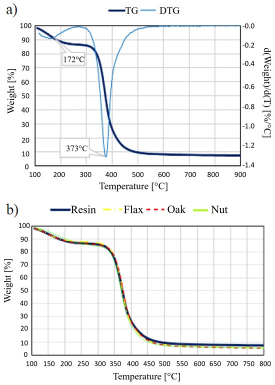 Figure 19a shows the analysis results for pure resin, for which the DTG curve was plotted. On its basis, it can be clearly stated that thermal degradation takes place in two stages. The temperatures with the fastest weight loss are 172 °C for the first stage and 373 °C for the second stage, respectively. The first stage, which runs in the temperature range from about 100 °C to about 230 °C, corresponds to water removal. The second stage, starting at a temperature of about 345 °C and lasting up to 500 °C, corresponds to breaking the bonds of the cross-linked polymer.