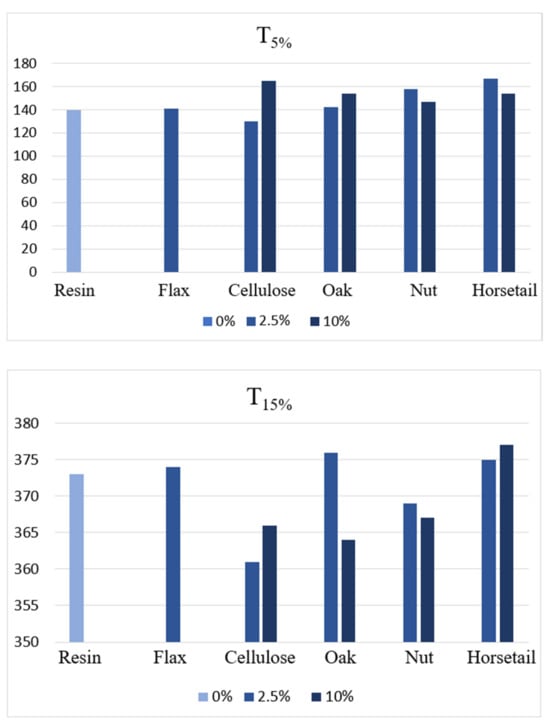 On the basis of the obtained results, it is difficult to determine the dependence of the influence of individual natural additives and their amount on the thermal stability of the material, which was defined as a 5% weight loss. For pure resin, it is 140 °C, and the handling of plant components contributed to a slight improvement in temperatures, from 141 °C to 167 °C. Theoretically, in order to increase thermal stability, additives with a high lignin content should be used due to the highest decomposition temperature among the main building components of plant raw materials. The relatively good results for the horsetail samples may be due to the relatively high silica content.