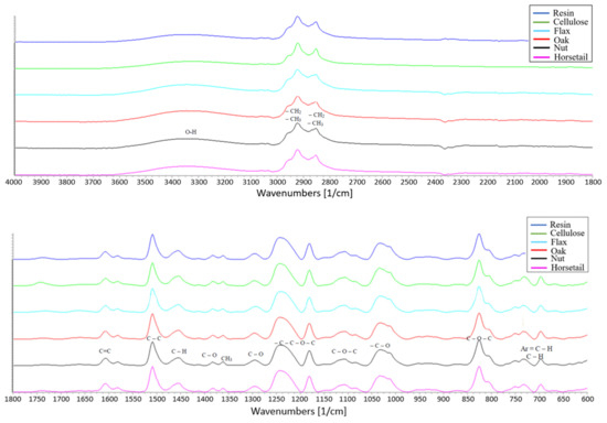 IR spectra of samples with epoxy resin matrix modified with natural additives (upper plot with range of 4000–1800 1/cm, lower plot with range of 1800–600 1/cm.