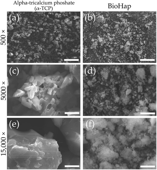 Particle shapes of alpha-tricalcium phoshate (α-TCP) and BioHap. (a,c,e) Scanning electron microscopy (SEM) images of alpha-tricalcium phosphate (α-TCP) particle carbon deposition sample. (b,d,f) SEM images of BioHap particle carbon deposition sample. (a,b) Scale bar is 50 μm (at 500× magnification). (c,d) Scale bar is 5 μm (at 5000× magnification). (e,f) Scale bar is 1.5 μm (at 15,000× magnification).