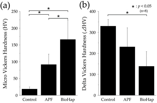Figure 3 shows graphs of the micro-HV after the acid challenge. The control group demonstrated an HV of 18.874 ± 6.302 HV, which was significantly smaller than those of the APF and BioHap groups (p < 0.05, Figure 3a). The HV values of the APF and BioHap groups improved to 91.817 ± 30.881 and 166.415 ± 57.496 HV, respectively (Figure 3a). A significant difference was observed between the APF and BioHap groups; the BioHap group exhibited the highest value (p < 0.05, Figure 3a).