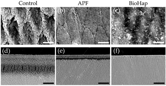 SEM images of enamel surface and cross-sections after acid challenge. Surface SEM images of the (a) control, (b) APF, and (c) BioHap groups. Scale bar is 2.5 μm. All images were recorded at 10,000× magnification carbon deposition samples. Cross-sectional SEM images of the (d) control, (e) APF, and (f) BioHap groups. Scale bar is 25 μm. All images were recorded at 1000× magnification carbon deposition samples.