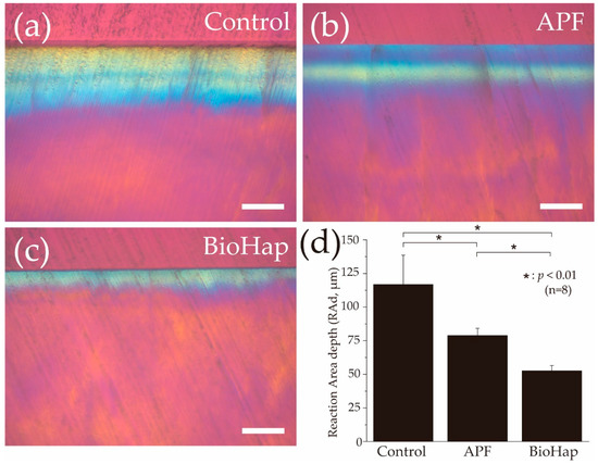 Figure 5 shows graphs and a RAd image obtained using a polarizing microscope after the acid challenge. In the control group, yellow and blue polarized regions were uniformly observed from the surface to the deep layer of the enamel, with a RAd of 116.804 ± 21.816 μm (Figure 5a). The RAd of the APF group decreased to 78.834 ± 5.391 μm; moreover, the blue polarized region increased (Figure 5b). The RAd of the APF group was significantly smaller than that of the control group (p < 0.01, Figure 5b,d). Moreover, the RAd of the BioHap group was significantly lower than that of the APF group (52.618 ± 3.868 μm; p < 0.01) (Figure 5c,d).
