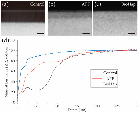 Contact microradiography (CMR) images of enamel cross-sections after acid challenge. CMR cross-sectional images of the reference and experimental surfaces after acid challenge in the (a) control, (b) APF, and (c) BioHap groups. Scale bar is 50 μm. (d) Graphical representation of mineral loss value (ΔZ) by tooth depth. Black, red, and blue lines represent the control, APF, and BioHap groups, respectively.