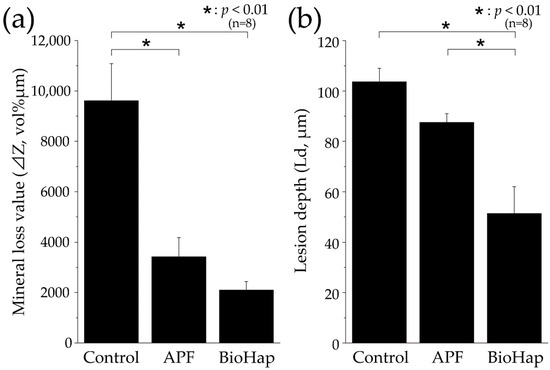 Graphical representations of mineral loss value (ΔZ) and lesion depth (Ld) after acid challenge. (a) Graphical representation of mineral loss value (ΔZ, n = 8, * p < 0.01). All eight samples were measured, and the mean ± standard deviation values were determined. (b) Graphical representation of Ld (n = 8, * p < 0.01). The depth of demineralization was determined from the surface before the demineralization experiment to a site with 95% healthy enamel. All eight samples were measured, and the mean ± standard deviation values were determined.