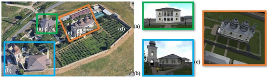 The Frumoasa monastery complex. (a) The Ruins of The Palace for Women; (b) The Bell Tower; (c) The Church of The Holy Archangels Michael and Gabriel and The Palace on The Walls; (d) The Enclosure Wall. Adapted from Google Earth [13].