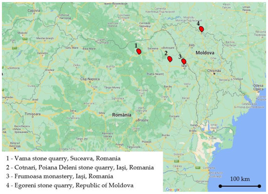 - For this study, four sample series were analyzed: S1, a sample series dislodged from the original wall of Frumoasa monastery (Iași, Romania); S2, a sample series extracted from Egoreni stone quarry (Republic of Moldova); S3, a sample series extracted from Poiana Deleni stone quarry (Iași, Romania); and S4, a sample series extracted from Vama stone quarry (Suceava, Romania).