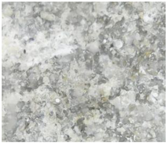 For all samples, the amount of clay minerals was less than 10% and the concentration of carbonates varied between 82% and 90%. As can be observed in Figure 3, the appearance of the samples was similar, except for the last specimen. The reddish-brown color of the S4 samples was due to the presence of iron and the venous texture was a consequence of multiple cracks in which the minerals could be found in very disparate amounts.
