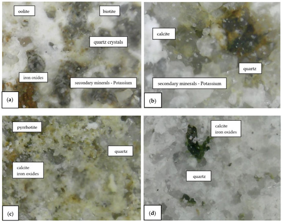 First, thin sections of 6 × 9 cm2 were prepared on all samples. The mineral compositions and textures were analyzed using an Olympus digital camera and shooting software corresponding with Olympus SZX 160 and U500XST2 microscopes. In addition, the XRF technique was implemented to determine the elemental composition of the samples. The measurements were realized using an isotope-free XRF spectrometer, type Innov X, combined with a mini PC.