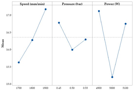 The linear and quadratic regression coefficient of power is higher than speed, which indicates that the laser power is significant. If the laser spot delivers maximum laser light energy to the target, it will be attenuated upon entering the material by the cutting speed, which is intended to reduce the interaction time between the material and the laser.