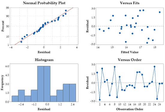 Figure 4 shows the residual values for the melting efficiency. When considered together, the residual plot tests show a similar good agreement with melting efficiency, which satisfies the ANOVA results.
