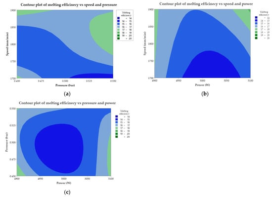 Figure 5). They were generated with the contour plot option in the Minitab software, having the role of adjusting and improving the response to the impact of several factors (pressure, speed), (power, speed), and (power, pressure). Through the area and strength of the color, the combination of factors contributing to the increase in melting efficiency, working conditions, and the predictor factor with the greatest influence can be deduced. It follows from the graphs that several parameters act simultaneously on the melting, which is why measures to control the working parameters are required. Consequently, investigation of predictors affecting part melting and cutting is necessary.