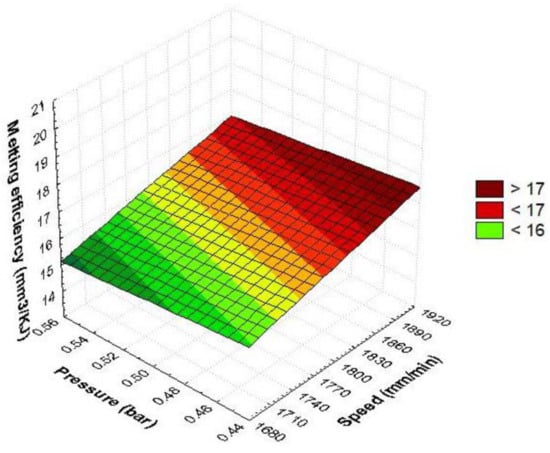 Figure 6). Responses vary linearly along a plane surface. This contains different colors that indicate the intensity of the output responses. If the cutting speed is in the range of (1860, 1900) mm/min and the pressure is in the range of (0.44–0.48) bar, the result is a high melting efficiency. Gradually setting the cutting parameters below these values has the effect of reducing the melting efficiency. Maximum values are obtained under conditions of maximum speed and minimum pressure. It is noted that increasing the pressure to the maximum value while maintaining the maximum speed causes a slight reduction in the melting efficiency. Cutting speed has a steeper slope compared to pressure. It follows that speed has a greater influence than pressure.