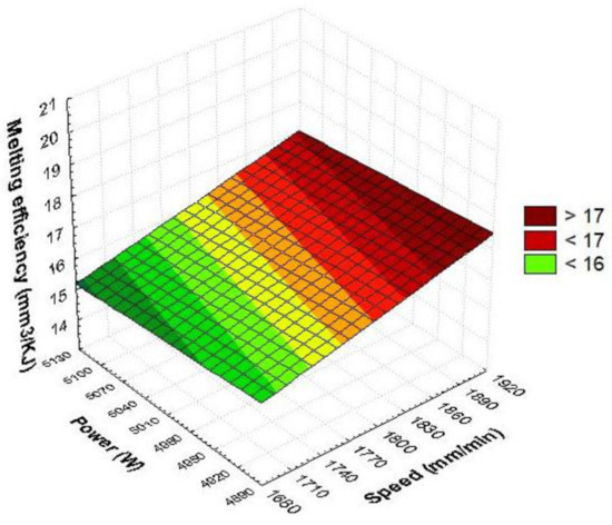Following the analysis of the models used for efficiency research, we found that the quadratic relationship (speed and power) promises the best melting efficiency greater than 17.5 mm3/KJ. The following observations emerge from the graphs obtained with RSM: