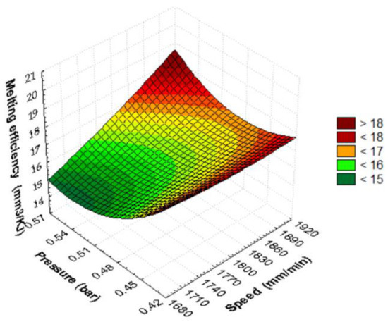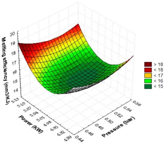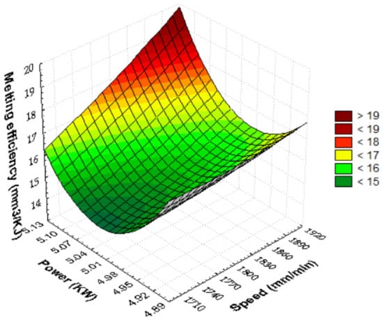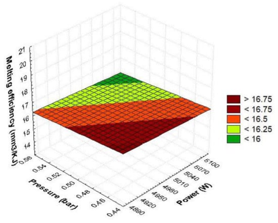 46]. The input data were combined with the responses, resulting in linear and quadratic regression relationships of melting efficiency. After checking the mathematical relationships with the controllable parameter values, the values from