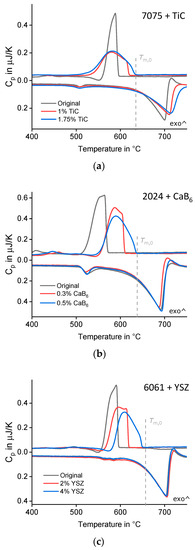 Exemplary DFSC heating and cooling curves (a) alloy 7075 without and with TiC nanoparticles, rate 104 K/s. (b) Alloy 2024 without and with CaB6 nanoparticles, rate 104 K/s. (c) alloy 6061 without and with YSZ nanoparticles, rate 103 K/s. The vertical axis shows heat capacity in µJ/K, exothermal reactions upwards.