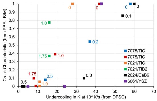 In Figure 4, we have added arrows as a guide for the eye, each arrow belonging to one aluminium alloy/nanoparticle system. Now it can be clearly seen, that crack characteristic C decreases with decreasing undercooling for all variants. For a given aluminium alloy/nanoparticle system, undercooling decreases with an increasing number of nanoparticles. The effect of undercooling on crack characteristics depends on the individual aluminium alloy/nanoparticle system, which can be explained by the different PBF-LB/M machines and parameters as well as crack measures used. In the bottom left corner of the diagram, we find a successful process window relative consistent for all investigated variants. A low solidification undercooling of less than about 10–15 K in DFSC (at a cooling rate of 104 K/s) correlates with almost crack-free PBF-LB/M components. This correlation can be used in future for the purposeful design of powder materials in small quantities (a few grams) before conducting extensive PBF-LB/M studies.
