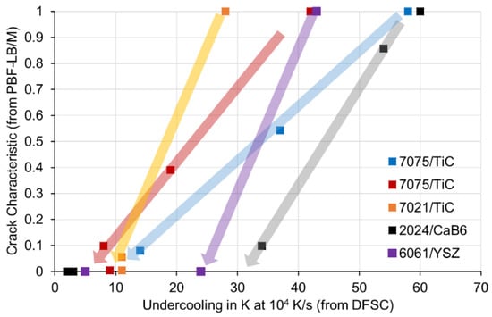 Correlation between crack characteristics C and solidification undercooling with arrows as guides for the eye. Relative crack characteristics of 2024/CaB6 and 6061/YSZ have been calculated from [11,13].