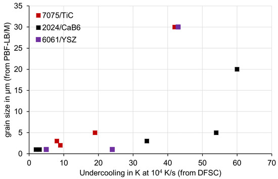 Correlation between grain size and solidification undercooling. Grain sizes of 2024/CaB6 and 6061/YSZ have been adopted from [11,13].