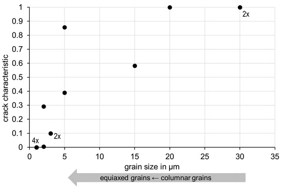 Finally, we have correlated crack characteristics C and grain size independent of the alloy/nanoparticle system (Figure 6). Some data points crack characteristic/grain size overlap in this diagram and have been marked accordingly (2×, 4×). As expected, crack characteristic C decreases with decreasing grain size. Moreover, in this diagram we find a successful process window in the bottom left corner which is relatively consistent for all investigated variants. Low grain size of less than about 3 µm correlates with almost crack-free PBF-LB/M components. As mentioned above, grain shape changes concurrently with grain size from large columnar grains to small equiaxed grains.