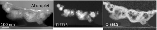 The reason for this low nucleation efficiency is unclear at the moment. One assumption is, that the nanoparticles added by ball milling stick to the relative stable natural oxide layer of the aluminium powder particles, which may hinder direct contact with the aluminium melt. This assumption is supported by the STEM/EELS cross-section image in Figure 8, which has been prepared from a single 7075/TiC particle after rapid solidification by DFSC. We can clearly see the TiC nanoparticles with dimensions of about 40 nm as well as the oxide layer in between. This assumption needs further investigation, but in case it is realistic, it would require other, more effective inoculation methods, i.e., adding nanoparticles inside the powder particle volumes [16]. This could drastically reduce the number of nanoparticles required to achieve a reduced solidification undercooling.