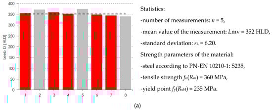 The hardness tests of structural steel in four selected places were analyzed. The result of the test was single rebound values (Leeb hardness number). The measurement results are presented in Figure 9.