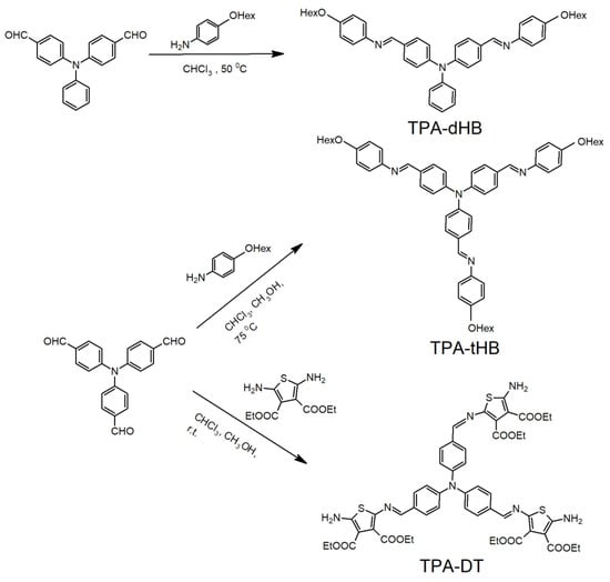 Three novel triphenylamine based azomethines were synthesized by the condensation of tris(4-formylphenyl)phenylamine with tiethyl-2,5-diamino-3,4-thiophenedicarboxylate (TPA-DT) and 4-hexyloxyaniline (TPA-tHB) and by the condensation of bis(4-formylphenyl)phenylamine with 4-hexyloxyaniline (TPA-dHB) under mild conditions (Figure 1).