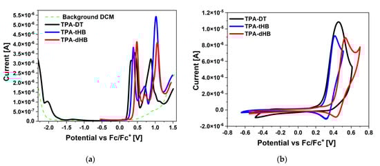 Presented azomethines were electrochemically active and exhibited two (TPA-DT) or three (TPA-tHB, TPA-dHB) oxidation processes associated with the presence of the electron-donating elements in the molecule (cf. Table 2 and Figure S4 in the Supplementary Materials). The one irreversible reduction process was seen for molecule TPA-DT with thiophene rings. The reduction process in the thiophenoazomethines may be related to the reduction in the imine bond and the thiophene ring [27,32]. In the case of azomethine with a triphenylamine core and a two amino-thiophene-3,4-dicarboxylic acid diethyl ester groups, reported in our previous work, two reduction processes were seen (Ered1 = −1.78 V and Ered2 = −2.23 V) [33]. The lack of the second reduction process was caused by the presence of an additional imine bond and a thiophene ring. It is possible that the imine bond reduction process takes place at a greater potential in this case, and the lack of its registration is related to the electrochemical window of the used solvent. The presence of a three amino-thiophene-3,4-dicarboxylic acid diethyl ester substituted hindered the reduction process, which influenced the position of ELUMO and thus the value of the energy band gap. Compounds TPA-tHB and TPA-dHB did not show the reduction process in a given electrochemical window.