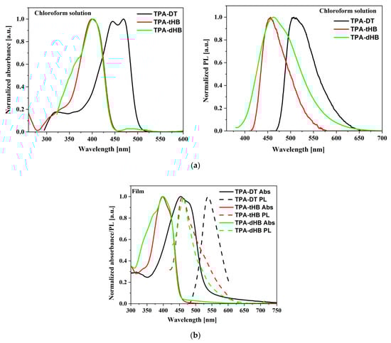 Figure 3. UV–vis and PL spectra of azomethines in chloroform (a), and in film (b).