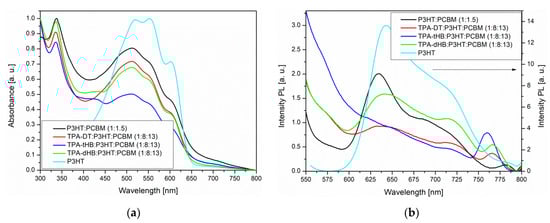 The azomethines were emissive in solid state as film and in the case of TPA-dHB and TPA-tHB PL quantum yield in film was higher compared to solution. The opposite behavior was seen in the case of TPA-DT, where the PL quantum yield in film was lower than in solutions. The observed higher PL quenching in TPA-DT film than the others may result from the presence of heavy atoms like sulfur, which may limit radiation processes [39] and/or formation of aggregates [37]. The azomethine with TPA core substituted with two amino-thiophene-3,4-dicarboxylic acid diethyl ester groups in films obtained from the chloroform and chlorobenzene solutions were non emissive [31]. The PL of imine blends with the same composition as was further used as active layer in photovoltaic cells was examined. For PV devices, the presence of an emission phenomenon is undesirable. To determine the emission quenching properties, a reference blend consisting of P3HT:PCBM (1:1.5) and ternary blends containing the tested compounds imine:P3HT:PCBM (1:8:13) was prepared. Hence, the materials forming the active layer should be characterized by a wide absorption band (donor) and the lowest possible emission intensity. As shown in Figure 4a, a P3HT often used as a donor has a wide absorption range from 400 to 650 nm range. However, it can be seen that it also exhibits emission properties. In BHJ solar cells, the active layer is a mixture of donor and acceptor, which should show low emission, and indeed PL of the P3HT:PCBM blend is weaker compared to a neat P3HT (Figure 4b). It is worth noting that a small addition of TPA-DT or TPA-tHB compounds further lowers the emission of the blends relative to the reference one. Moreover, the addition of TPA-dHB is less likely to cause emissions quenching than the other tested imines. It can therefore be concluded that the tested azomethines cause PL quenching, which is desirable for the PV devices. The emission quenching is caused by photoinduced charge separation between electron donating and electron accepting molecules. More efficient emissions extinction could suggest more efficient extinction separation charge transport and separation [40,41]. The addition of TPA-DT resulted in a more efficient quenching of PL, which could suggest that this would be the most promising for PV cells.