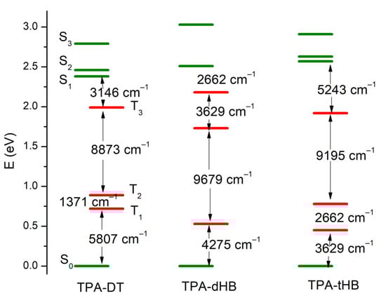 Figure 5. Low-lying energy states in TPA molecules (green lines—the singlet excited states and red lines—triplet excited states).