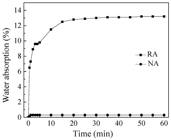 As shown in Figure 1, the saturated water absorption rate of NA was very small (0.3%), and it reached water absorption saturation in about 1 min; while RA contained a large amount of broken brick particles, the saturated water absorption was very high (14.1%), and its water absorption was a gradual process from fast to slow: the initial water absorption was fast, and the water absorption rate reached 6.5% at 1 min, and then continued to increase. It gradually stabilized after 20 min, and reached 13.2% at 60 min. Therefore, the water absorption characteristics of RA must be considered when preparing concrete. If dry RA was used, the additional water consumption was counted at the saturated water absorption of 14.1%, and the mixed concrete will occur serious bleeding phenomenon, which was caused by the inability of rapid absorption of excessive additional water. Through several experiments, the amount of additional mixing water was finally determined based on the 10 min water absorption of RA, and four kinds of concrete mix proportions were designed (see Table 4). In Table 4, the natural coarse aggregate was in a dry state, the porous recycled coarse aggregate was in a dry state, air-dried state and saturated surface-dry state, respectively. The four groups of concrete were recorded as NAC, RAC-G, RAC-Q and RAC-B, where NAC and RAC-B have no additional water, and for RAC-G and RAC-Q, the quantity of additional water was computed by the 10 min water absorption of RA.