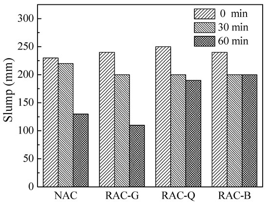 It can also be seen from Figure 2 that the slump loss of NAC and RAC-G groups at 60 min is significant, and the slump at 60 min is 130 mm and 110 mm, respectively, which does not meet the requirement of GB/T 14902-2012 “Ready Mixed Concrete” that the slump value of pumped concrete is not less than 180 mm. While the slump loss of RAC-Q and RAC-B group is less. The slump loss of RAC-G, RAC-Q and RAC-B at 60 min were significantly different, which were 54.2%, 24.0% and 16.7%, respectively. The reason was that the additional mixing water initially added to RAC-G was largely absorbed by the dry coarse aggregate within 1 h, which significantly reduced the thickness of water film on the particles surface and thus caused an extremely reduction in the slump of concrete. In contrast, RAC-Q contained a certain amount of water in itself, the moisture gradient between the coarse aggregate and paste was less than that of dry coarse aggregate, and the water migration speed was slower, thus the slump loss at 60 min was smaller. As the brick–concrete recycled coarse aggregate was saturated with water, the slump loss of RAC-B was mainly caused by cement hydration and water evaporation, and the saturated brick–concrete recycled coarse aggregate also had a certain role of water supplement, so the slump loss at 60 min was minimal (see Figure 2).