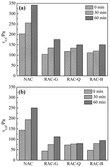 From Figure 3a,b, the static yield stress and dynamic yield stress of NAC with natural aggregate are the highest at 0, 30 and 60 min, and the static and dynamic yield stress increase significantly with the prolonging of time. The static and dynamic yield stresses in the RAC-G, RAC-Q and RAC-B groups were lower due to the addition of additional mixing water or the pre-wetting of the aggregates. With the extension of time, the static yield stress and the dynamic yield stress of RAC-G also increased more, while the static yield stress and the dynamic yield stress of RAC-Q and RAC-B grew less, indicating that the super water absorption of dry aggregates made the W/B of cement paste decrease rapidly, and the flocculation structure of the paste is more easily enhanced, which is the same pattern as the slump test results. The dynamic yield stresses in Figure 3b are smaller than the corresponding static yield stresses in Figure 3a. This is because the dynamic yield stress is relevant to flow cessation, while the static yield stress is associated with flow initiation [31]. The difference between the two is a reflection of the thixotropy of the concrete mixture [32].