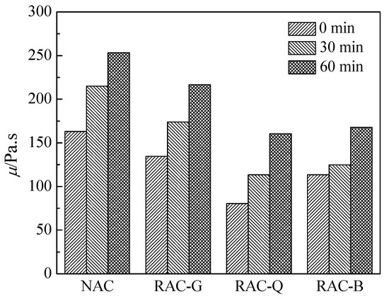 The results of the variation of plastic viscosity of fresh concrete with time are shown in Figure 4. The plastic viscosity values of RAC-G, RAC-Q and RAC-B at 0, 30 and 60 min are smaller than those of NAC. The plastic viscosity reflects the rate of deformation of fresh concrete under the action of shear stress, which is mainly correlated with the amount of internal flocculation structures in the paste and the degree of damage [32], as well as the thickness of water film adsorbed on the particle surface [33]. Since additional water was added to RAC-G and RAC-Q, and RAC-B was pre-treated with water immersion, which increased the free water in the initial state and thickened the water film on the particle surface, so the plastic viscosity was lower than that of NAC group. With the progress of cement hydration process, the gravity between cement particles increases, the flocculation structure increases, the adsorbed water film becomes thinner, and the plastic viscosity increases. Compared with the RAC-G and RAC-B, the plastic viscosity of RAC-Q at 0 min, 30 min and 60 min was smaller, indicating that compared with the dry and saturated surface dry states, the moisture distribution inside the air-dried aggregate was more uniform and the adsorbed water film thickness was larger.