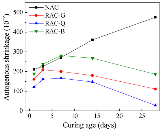 As seen in Figure 5 that the autogenous shrinkage value of NAC was sustainably increasing within 28 days. This was because of the continuous hydration of cement, which caused a constant decrease in free water and humidity in the concrete, resulting in a continuous increase in autogenous shrinkage. RAC-G, RAC-Q and RAC-B prepared with recycled brick–concrete coarse aggregate obviously inhibited the autogenous shrinkage of concrete after 3~7 days, which significantly reduced the autogenous shrinkage of concrete. The reason is that the recycled coarse aggregate of brick–concrete in RAC-B contained water itself, while the recycled coarse aggregate of brick–concrete in RAC-G and RAC-Q absorbed a lot of water from the paste in the initial period. Therefore, when the internal moisture of concrete decreased in the later period, it is able to release water continuously to maintain sufficient humidity inside the concrete and act as an internal curing, so that the autogenous shrinkage was significantly reduced.