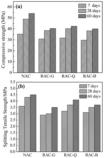 Compressive strength of concrete (a) and splitting tensile strength of concrete (b).