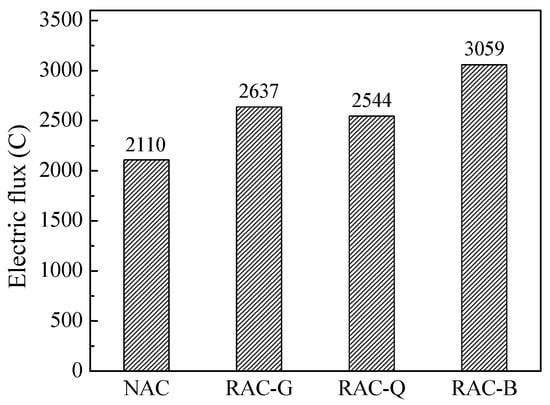 Resistance to chloride permeability of brick–concrete recycled coarse aggregate concrete with different moisture conditions was tested using the electric flux method, as shown in Figure 8.