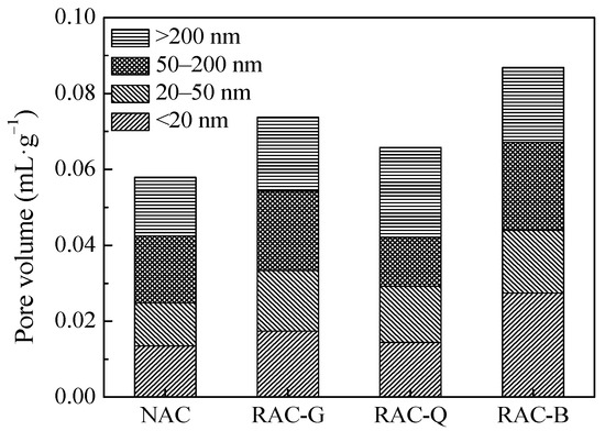 In Figure 9, the total pore volume of the mortar parts of RAC-G, RAC-Q and RAC-B was greater than those of NAC, which indicates that the pore structure of the mortar part was deteriorated by either the additional water or the water saturation process. The reason may be that the water absorption (dry and air-dried state) and water release (saturated surface dry state) effects of the recycled coarse aggregate, which caused the water transfer in the cement mortar and caused the increase of the pores of the cement mortar. In brick–concrete recycled coarse aggregate concrete, the pore volume of RAC-B was the highest. There exists water release effect in RAC-B, which increased the W/B of cement paste. Another aspect, although additional water was added to RAC-G and RAC-Q, the quantity of additional water added was computed based on water absorption rate in 10 min, which was less than the saturated water absorption. The additional water will be absorbed by the brick–concrete recycled coarse aggregate, and the actual effective W/B of the cement paste was smaller than that of RAC-B, as a result the pore volume of the mortar part of RAC-B was the highest. The reason for the pore volume of RAC-G mortar was higher than that of RAC-Q may be that the additional water volume in RAC-G was greater than that of RAC-Q, and the humidity gradient between RAC-G paste and coarse aggregate was greater than that of RAC-Q. Therefore, during the process of water migration, the osmotic pressure was greater and the damage to the structure was more significant, leading to the increase of the pore volume in RAC-G.