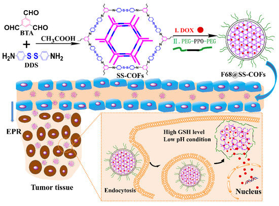 - Liu, S.; Yang, J.; Guo, R.; Deng, L.; Dong, A.; Zhang, J. Facile Fabrication of Redox-Responsive Covalent Organic Framework Nanocarriers for Efficiently Loading and Delivering Doxorubicin. Macromol. Rapid Commun. 2020, 41, 1900570. [Google Scholar] [CrossRef] [PubMed]