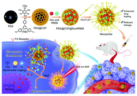 - Gao, P.; Wei, R.; Liu, X.; Chen, Y.; Wu, T.; Shi, M.; Wang, M.; Li, N.; Tang, B. Covalent Organic Framework-Engineered Polydopamine Nanoplatform for Multimodal Imaging-Guided Tumor Photothermal-Chemotherapy. Chem. Commun. 2021, 57, 5646–5649. [Google Scholar] [CrossRef]