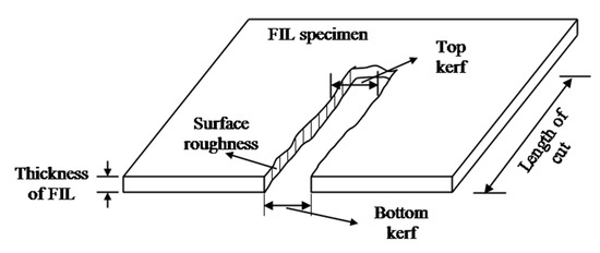 The cutting experiments were performed on three different categories of FILs fabricated with 0, 1, and 2 wt% of r-GO nano fillers through a high-precision cantilever type computer numerical controlled AWJC system (S3015, Waterjet Germany, Chennai, India). The AWJ machine is equipped with a high-pressurized intensifier pump of operating pressure ranging up to 450 MPa and a carbide focusing tube of 0.76 mm diameter to achieve efficient machining operations. The machining parameters, such as the abrasive flow rate of 200g/min, the garnet abrasive particle size of ~177µm (80 mesh), the orifice diameter of 0.276 mm and the jet impact angle of 90°, are constantly maintained throughout the experiments. As per the RSM-BBD experimental design strategy for four dependent variables with three levels such as r-GO addition of 0, 1, and 2 wt%, traverse speed of 400, 500, and 600 mm/min, waterjet pressure of 200, 250, and 300 MPa, and stand-off distance of 2, 3, and 4 mm, a total of 29 straight parallel slots were made in the different FILs with a cutting length of 50 mm for the investigation of Kt and Ra. The range of AWJC parameters was selected by performing extensive preliminary studies. The typical AWJC experimental setup and processed FIL specimens is depicted in Figure 3. The AWJC system consists of abundant process-related dependent variables, whereas the most significant variables such as TS, WP, and SOD, suggested by previous researchers, were selected for the present investigation. The kerf taper at jet entry and exit of the machined FILs were computed using a METZ 1395 (Metzer Instruments, Mathura, India) tabletop microscope and the surface quality at the kerf side surface was measured using a non-contact three-dimensional profilometer (Talysurf CCI Lite, Taylor & Hobson, Leicester, UK). The computational errors were minimized by measuring Kt and Ra thrice and their mean values was considered as responses. The schematic representation of measuring Ra and Kt has been shown in Figure 4. The response features obtained from the AWJC of FILs are further considered for statistical validation and optimization, as presented in Table 1.