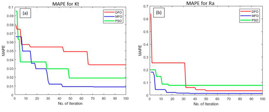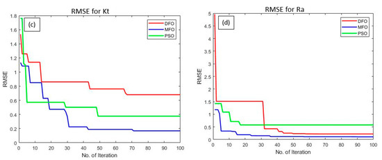 The proposed algorithms were executed several times for improving the prediction capability of the ANFIS network by minimizing the MAPE and RMSE during the training of the network. The algorithms were simultaneously executed for 100 iterations in order to obtain the optimal ANFIS parameters. The convergence plots of DFO, MFO, and PSO algorithms as shown in Figure 6a–d, which indicates the correlation between the number of iterations and their consequences on the ANFIS outputs such as MAPE and RMSE for the response features such as Kt and Ra. The convergence plots show that the MFO algorithm has converged effectively and produced minimized MAPE and RMSE values when compared with the other two optimization algorithms. In addition, the statistical analysis results (normal distribution of data) have also proved that the MFO algorithm is efficient in the training of the proposed ANFIS network parameters at a 95% confidence interval, with an improved Anderson squared value of 0.72 for MAPE and 0.92 for RMSE, respectively (Figure 7 and Figure 8).