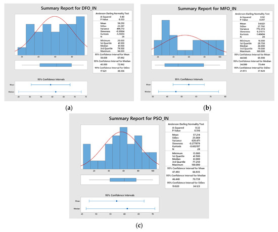 Statistical analysis for MAPE obtained from: (a) DFO, (b) MFO, and (c) PSO.
