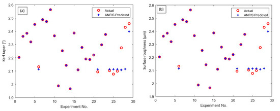 ANFIS predicted response values vs. experimental measured values: (a) Kt, and (b) Ra.