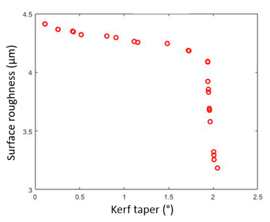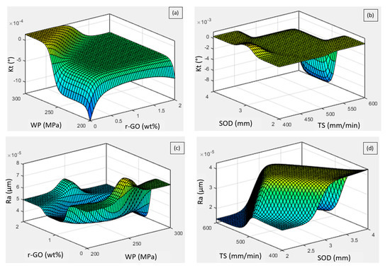 The influence of various AWJC parameters and the inclusion of r-GO with varying weight percentages on the quality characteristics of processed FILs at varying cutting conditions are described in the ANFIS surface plots (Figure 10a–d). The influence of waterjet pressure (WP) and wt% of r-GO on Kt is represented in the 3D surface plot (Figure 10a). The plot reveals that Kt linearly increases with an increase in WP from 200 bar to 300 bar, whereas a slight variation in Kt has been found when the addition of r-GO has been increased from 0 to 2 wt%. When the waterjet pressure is increased, the FILs may be impinged upon by the kinetic energy and flow turbulence of the water-jet stream, creating a wider slot. In addition, interparticle collision is increased by flow turbulence and water-jet expansion, which widens the kerf surface’s taper [12,24]. The consequences of traverse speed (TS) and stand-off distance (SOD) on Kt have been demonstrated in Figure 10b. The plot shows that Kt is linearly widening with an increase in SOD from 2 mm to 4 mm and TS from 400 mm/min to 600 mm/min. This might be because of a narrowing of the effective waterjet caused by higher SOD, which causes the waterjet to flow away from the focusing tube and contract into abrasive particles. As a result, the cutting and penetrating zones of abrasive particles in a waterjet are reduced in energy. The kerf on the bottom cut surface is consequently smaller than the kerf on the top cut surface. Kt was therefore found to be greater at higher SOD levels [25].